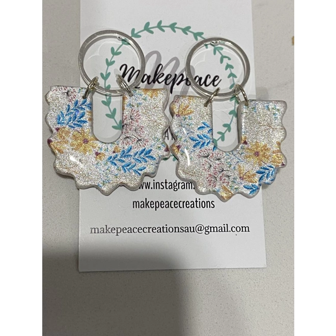 THESE RUFFLED U SHAPED EARRINGS ARE MADE WITH A PEARL POLYMER CLAY AND HAS A WATER SOLUBLE TRANSFER APPLIED TO THE TOP. SILVER JUMP RINGS AND LARGE OPEN ROUND STUDS, SEALED AND FINISHED OFF WITH UV RESIN. ONLY ONE PAIR AVAILABLE