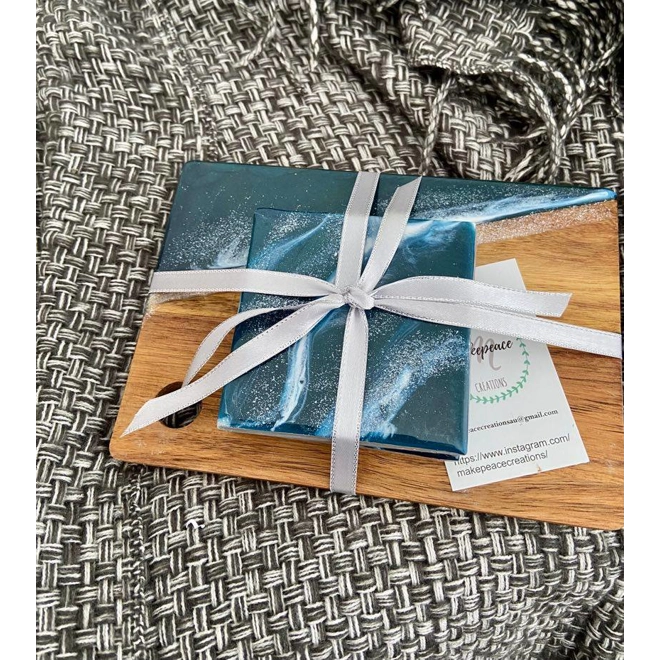 SMALL ACACIA WOOD BOARD WITH SMALL RESINED AREA FOR DECORATION AND 2 CERAMIC TILES COVERED WITH RESIN AND SUITABLE FOR HOT OR COLD DRINKS.